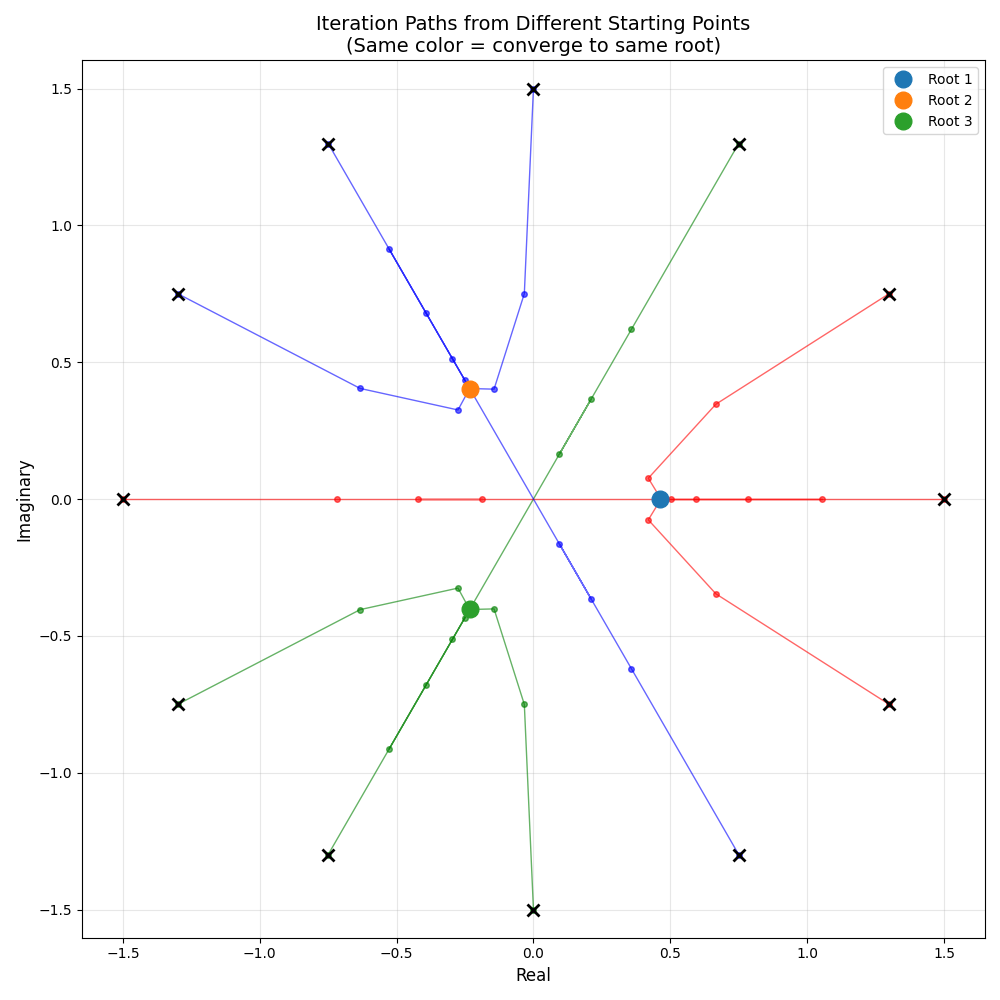 The small red dots show it converging towards the root real: 0.4641588833612779, imaginary: 0.0