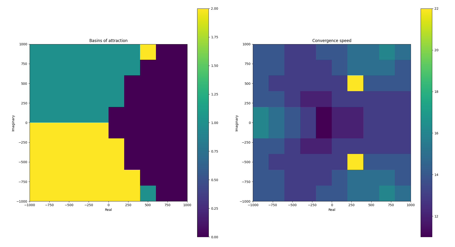 The results for finding the roots for the function f(z) = z^3 - 1 aren’t super impressive. That’s what is shown in the “Basins of attraction” image on the left:
