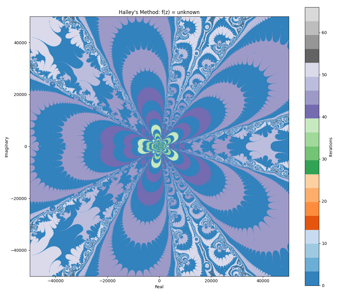 # root_map, iter_map = halley_fractal(f, df, ddf, roots, max_iter=max_iter)