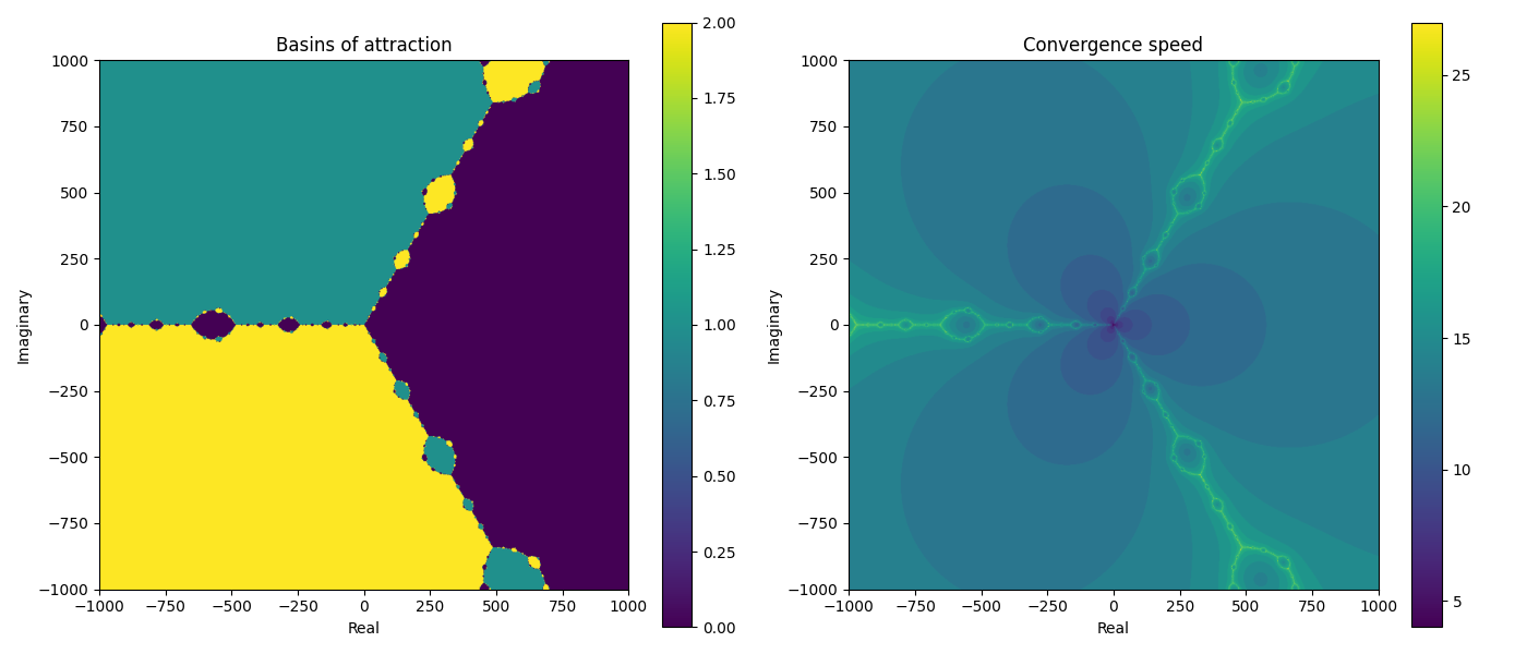 root_map, iter_map, xs, ys = halleys_roots_fractal(